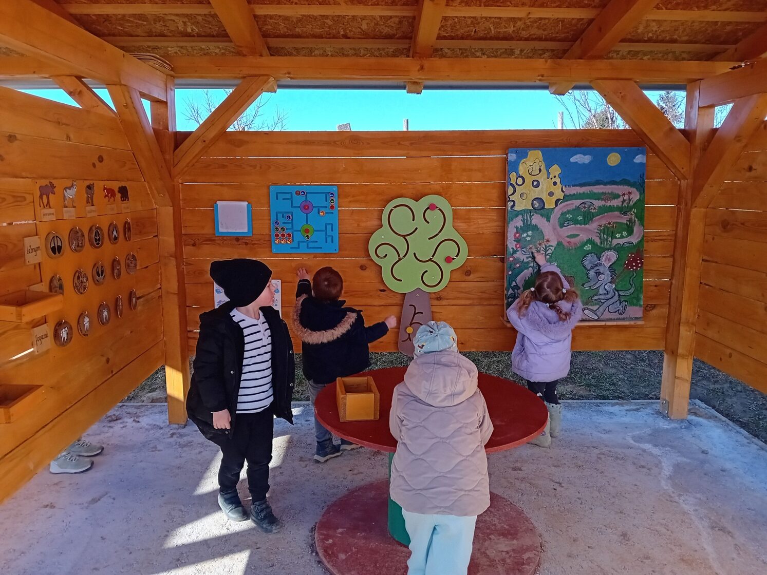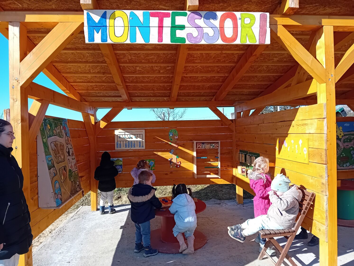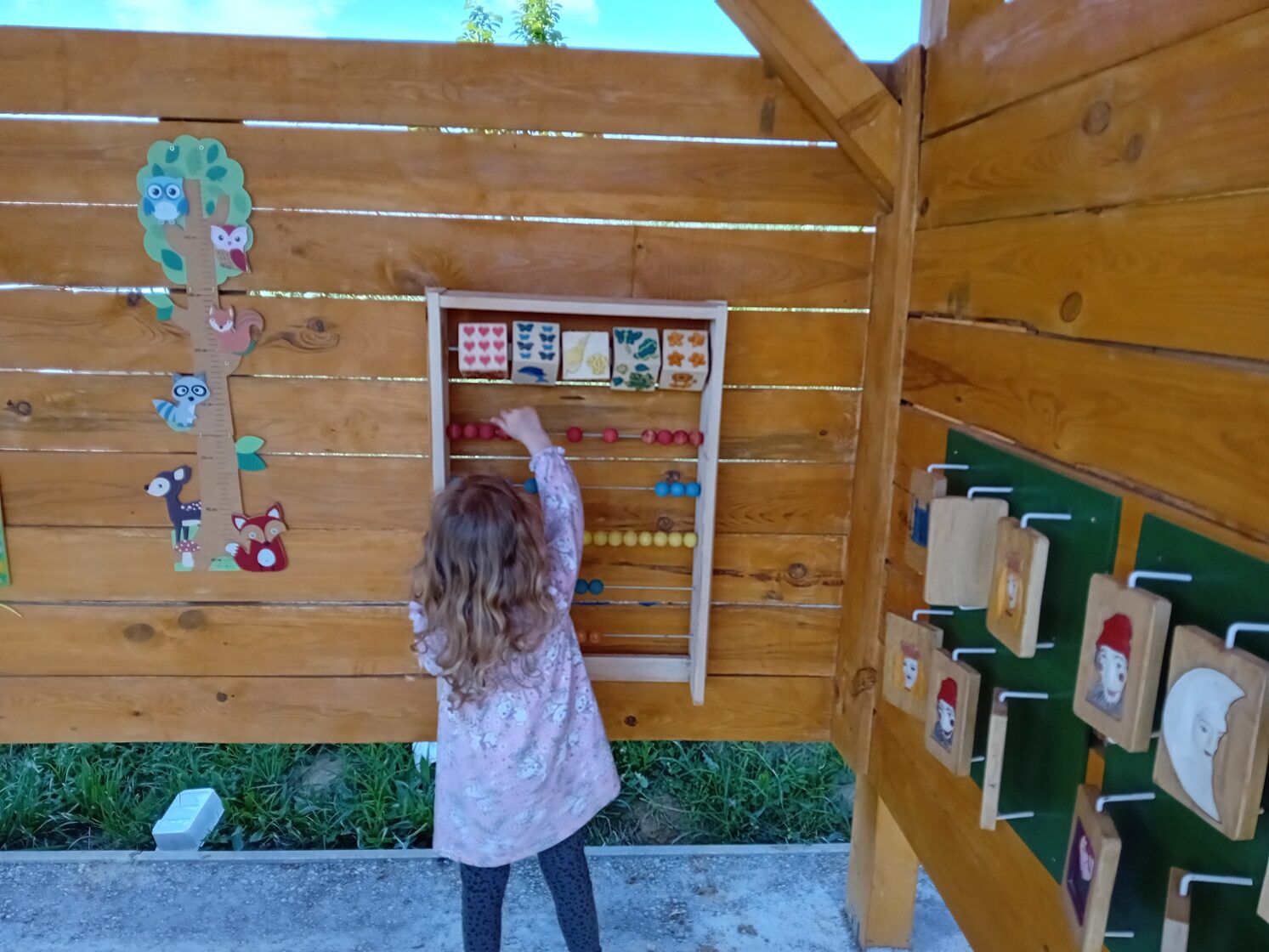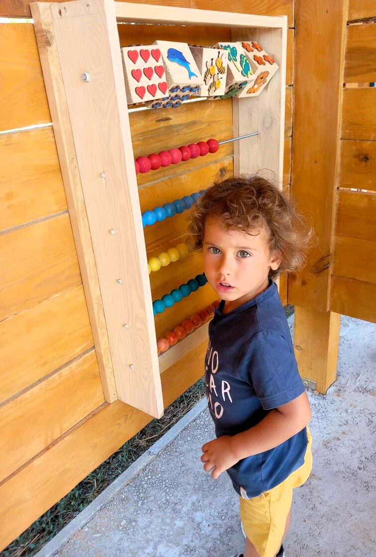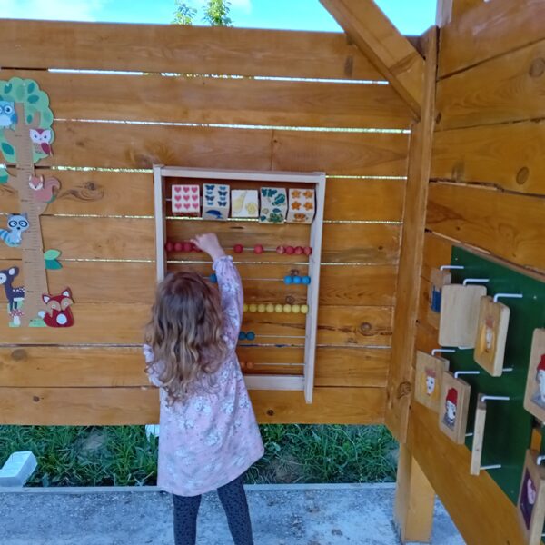 Kedvenc hely a „Montessori-kuckó” – fából készült, tágas játékház, tele ügyességi és logikai fajátékokkal.