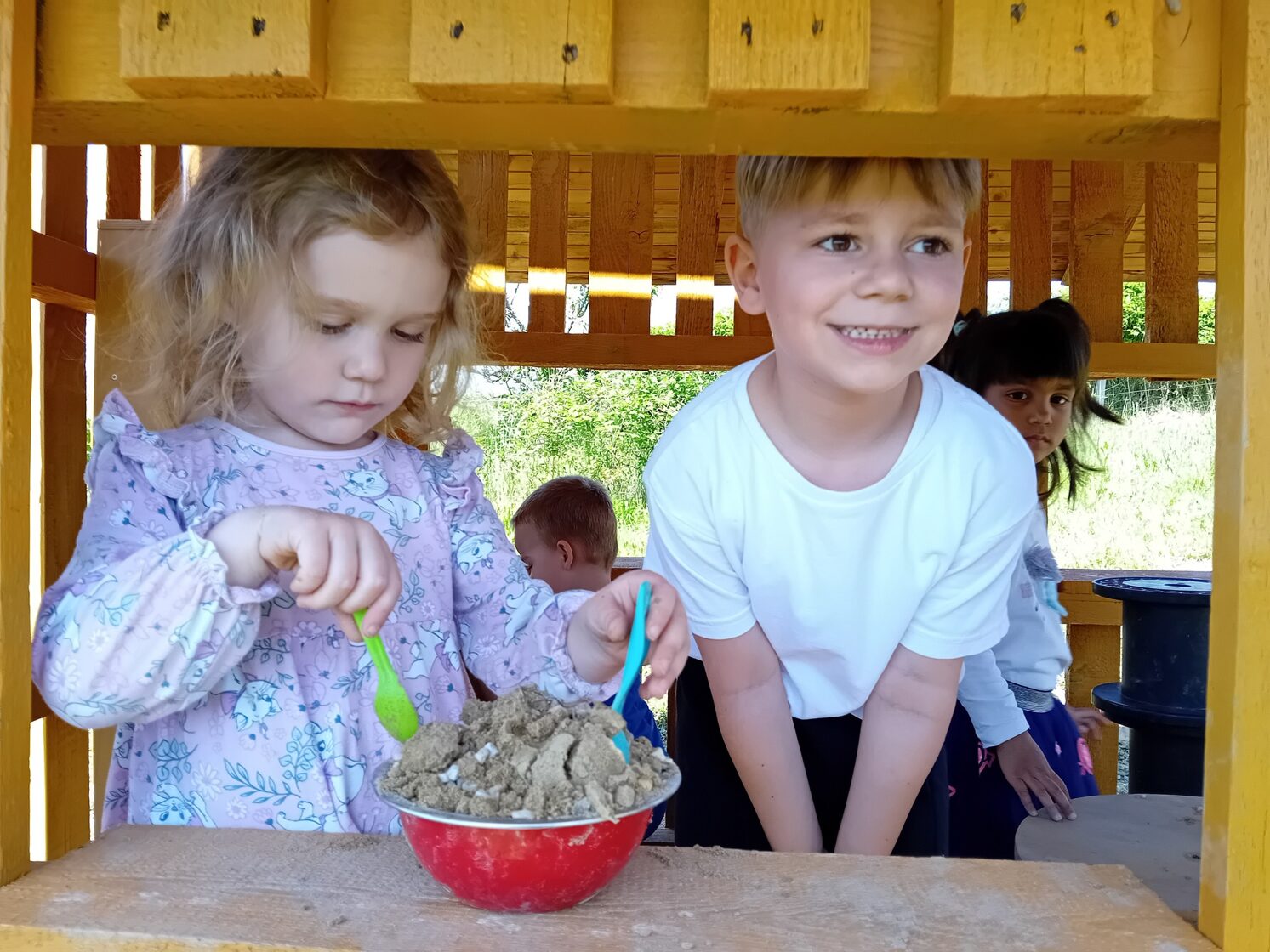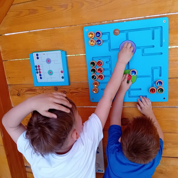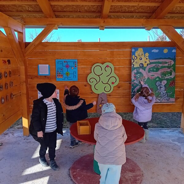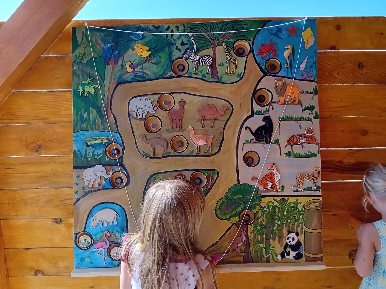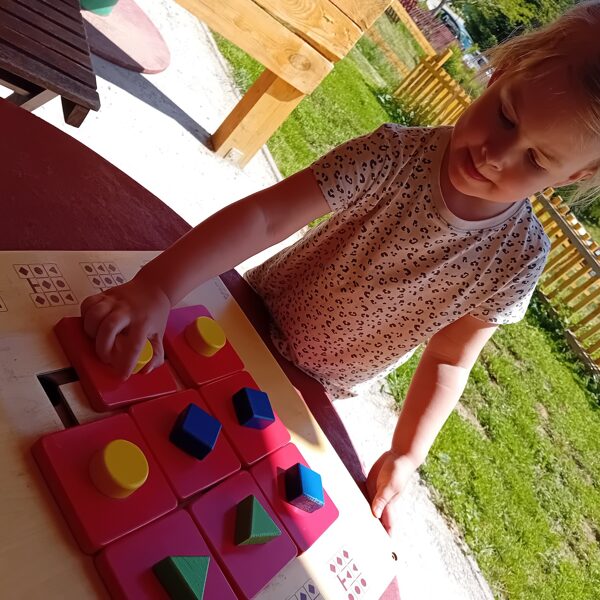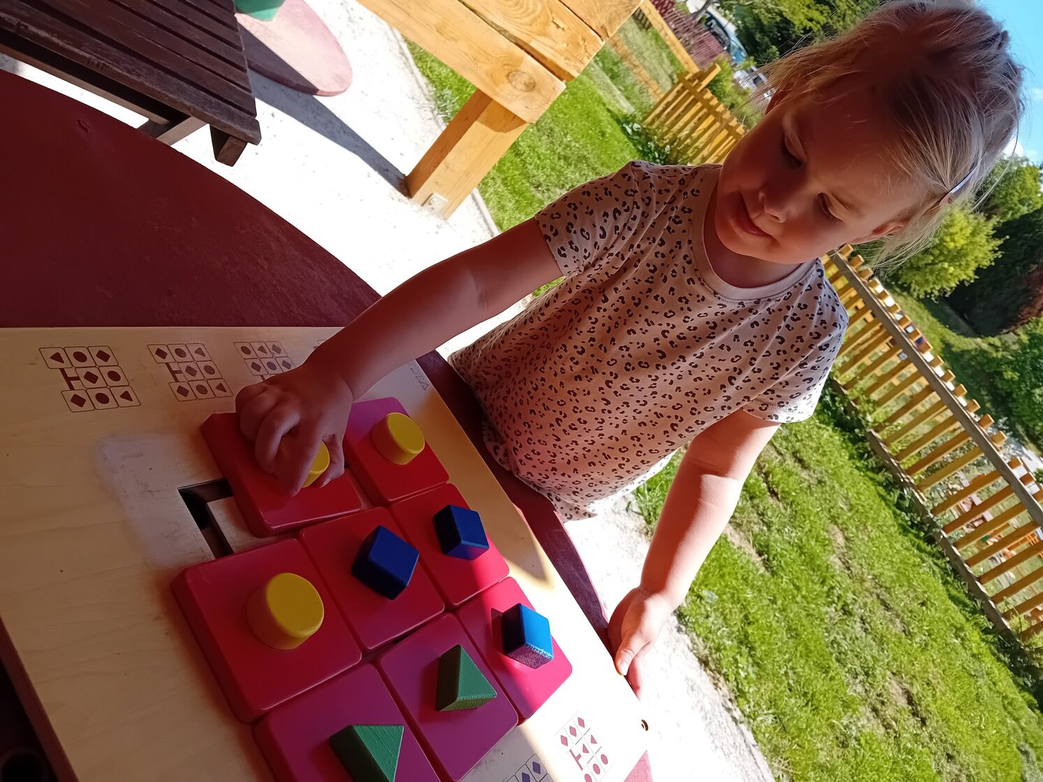 Kedvenc hely a „Montessori-kuckó” – fából készült, tágas játékház, tele ügyességi és logikai fajátékokkal.