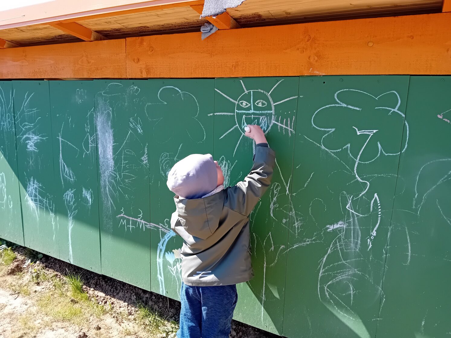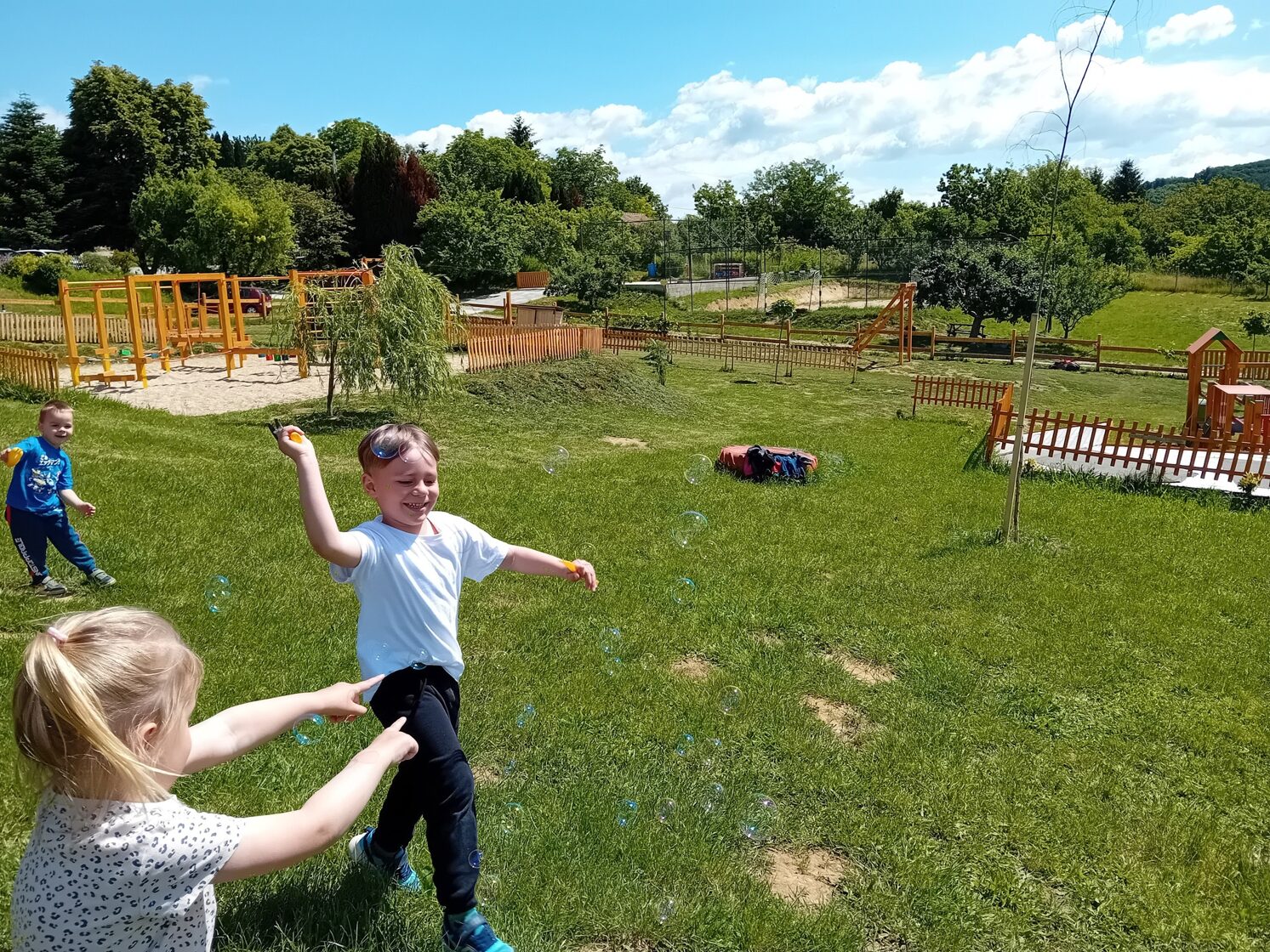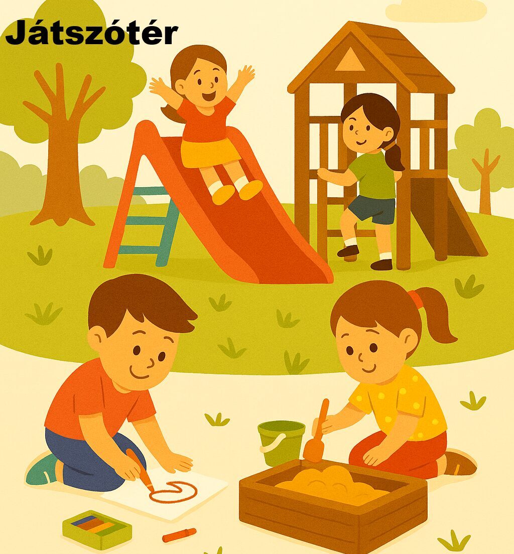 Modern, biztonságos mozgásfejlesztő játékok, hatalmas rajztábla a szabad alkotáshoz, zöld domboldal futáshoz, mászáshoz, guruláshoz.